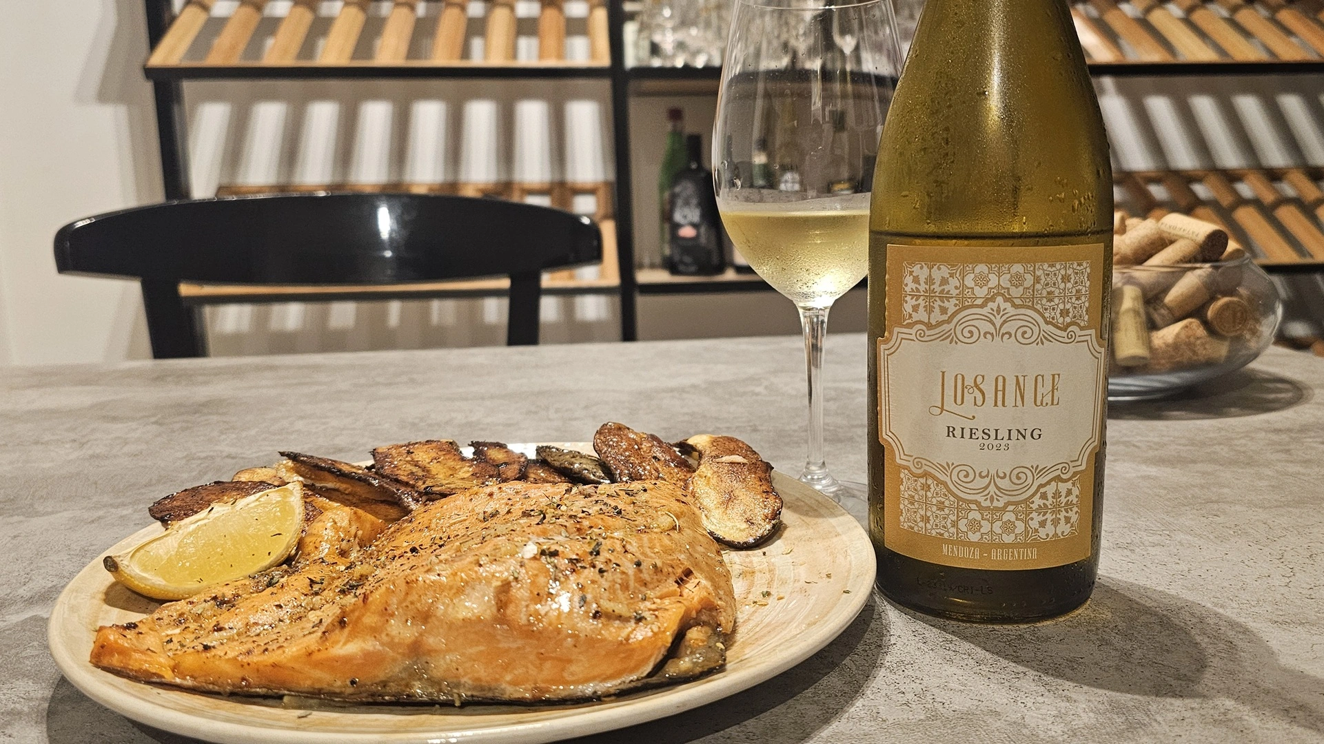Para esta ocasión elegí un Riesling del Valle de Uco, Losance Riesling 2023, y lo maridé con trucha patagónica al horno sobre una base de papas laminadas tipo boulangère. En una sartén derretí manteca, sumé ajo cincelado y una copa del mismo Riesling que estaba tomando; con esa manteca perfumada rocié el pescado antes de llevarlo al horno sobre las papas.